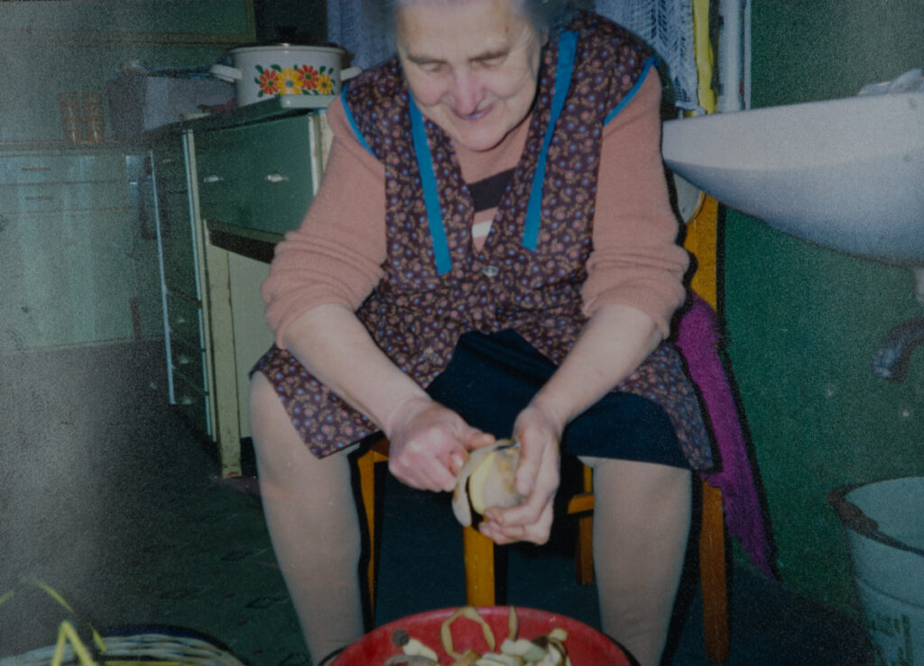 Oma Anna Kartoffeln schälend in ihrer Küche